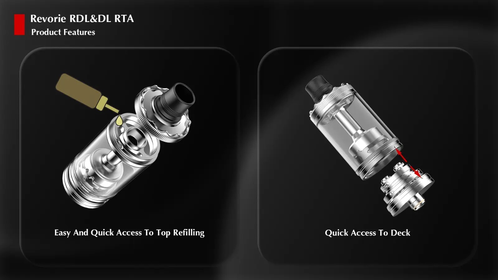Revoire RDL/DL RTA od značky Ambition Mods patří mezi špičku ve své třídě a nadchne každého, kdo hledá high-end atomizér s moderními funkcemi za dostupnou cenu. Tento model nabízí jednoduchou jednospirálkovou základnu se šroubky, objem 5 ml a inovativní ovládání juiceflow a chlazení. Všechny tyto vychytávky jsou zabalené do minimalistického, ryze funkčního designu.