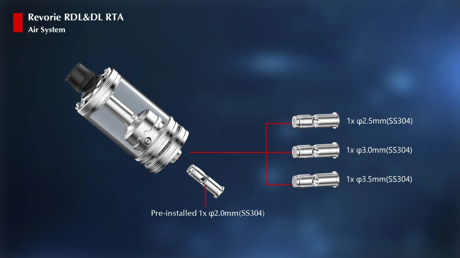 Regulaci přísunu vzduchu zajišťují výměnné AFC piny v průměrech 2.0, 2.5, 3.0 a 3.5 mm. Výměna je extrémně snadná, nemusíte ani vypouštět liquid nebo rozebírat spirálku. Mezera mezi základnou a dolní částí atomizéru zlepšuje proudění vzduchu a spolu se speciálním difuzérem navíc účinně chladí celé tělo – což oceníte zvlášť při vyšších výkonech.