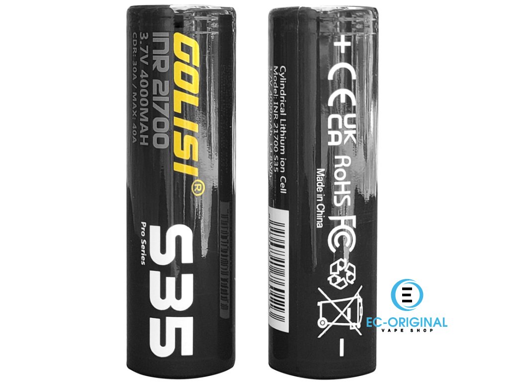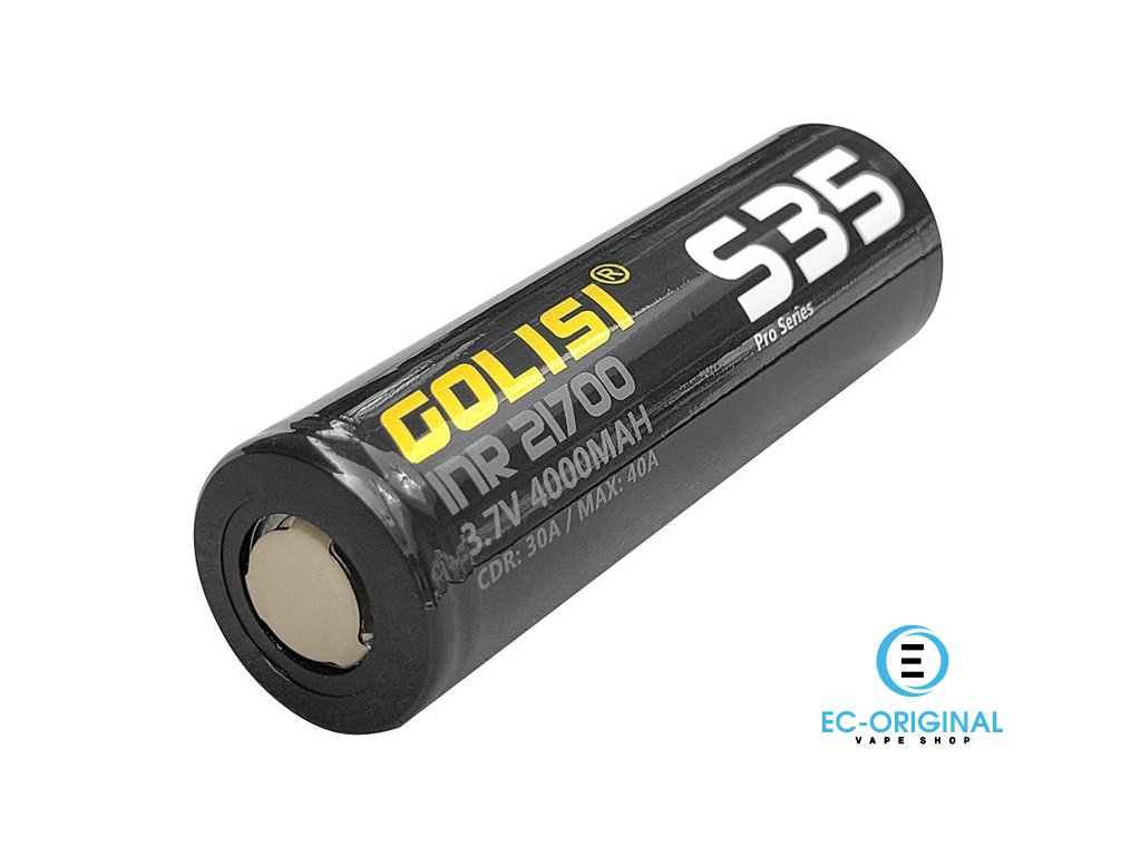 Nová revoluční baterie typu Golisi S35 21700 představuje revoluci v pravém slova smyslu. Tato baterie nabízí obrovskou kapacitu a efektivní vybíjecí proud, který rozžhaví váš atomizér rychleji, než kdykoliv předtím. Baterie zároveň drží svou kapacitu mnohem lépe, než předchozí články 18650. Tato baterie je vhodná pro gripy a mody se slotem 21700. Její kapacita dosahuje 4000 mAh a vybíjecí proud až 40 A. Baterii lze použít převážně pro nízkoodporový vaping.