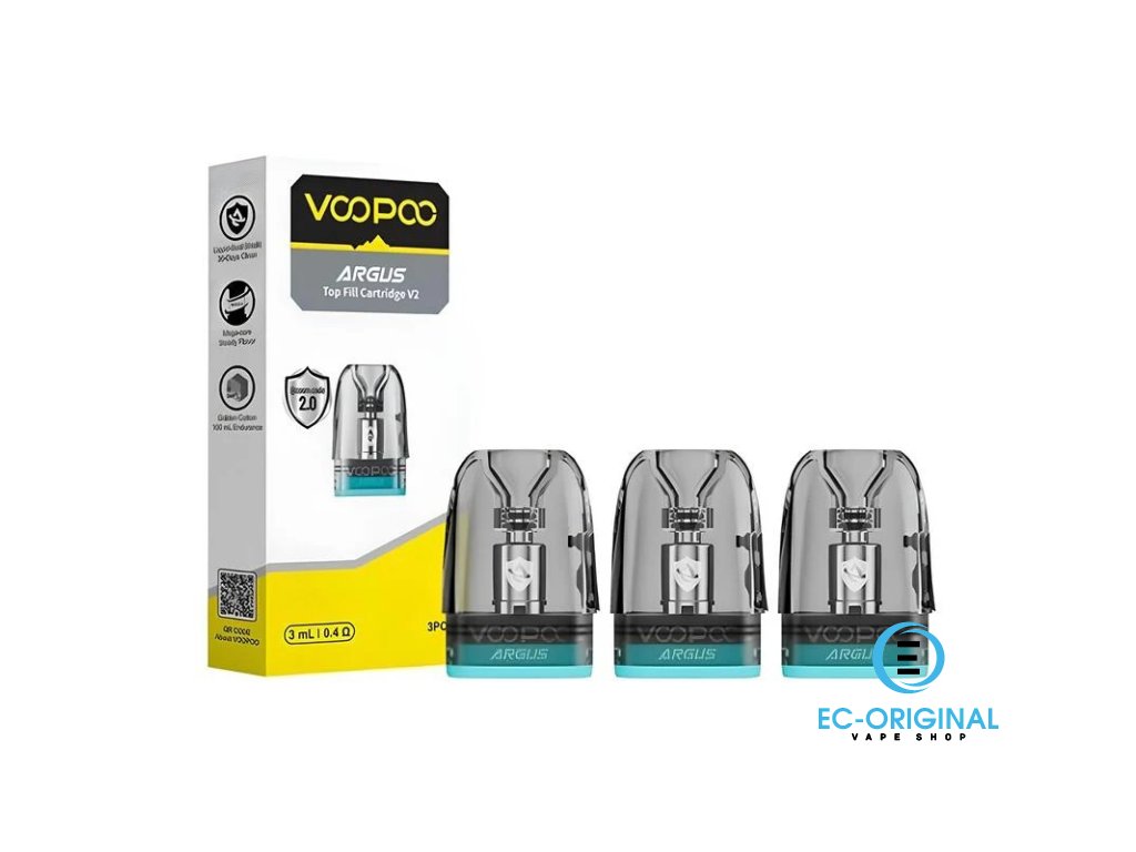 Cartridge VooPoo Argus Pod Top Fill V2 přichází s technologií iCOSM Code 2.0, v jejich centru se nachází moderní široké Mega-Core jádro a speciální izolační štít (Liquid-Seal Shield) pro efektivní a rovnoměrné zásobení vaty e-liquidem. Tento štít dokáže rovnoměrně nasát e-liquidem až 99% povrchu vaty uvnitř jádra. Mesh pletivo je potom obaleno inovativní a patentovanou zlatou vatou (Golden Cotton), která maximalizuje absorpci a prodlužuje životnost cartridge díky odolnosti vůči teplotě na spirálce až do 260 °C.